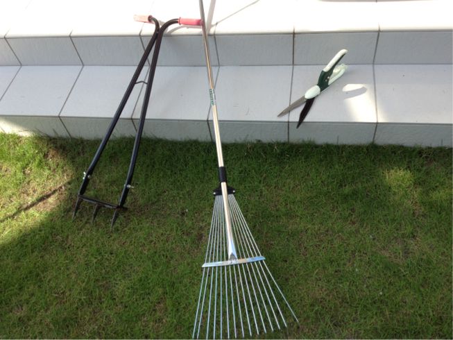 続いて、熊手(レーキ)で芝生を掻いてサッチングして…