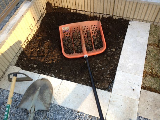 植樹ゾーンの土を掘って…掘った土を振るいにかけて石を採りました…