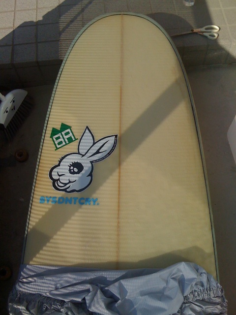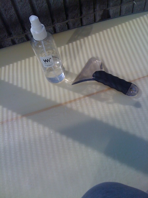 ボードのステッカー貼る位置に塗ってあるワックスをスクレーパーとリムーバーできれいに落とします。