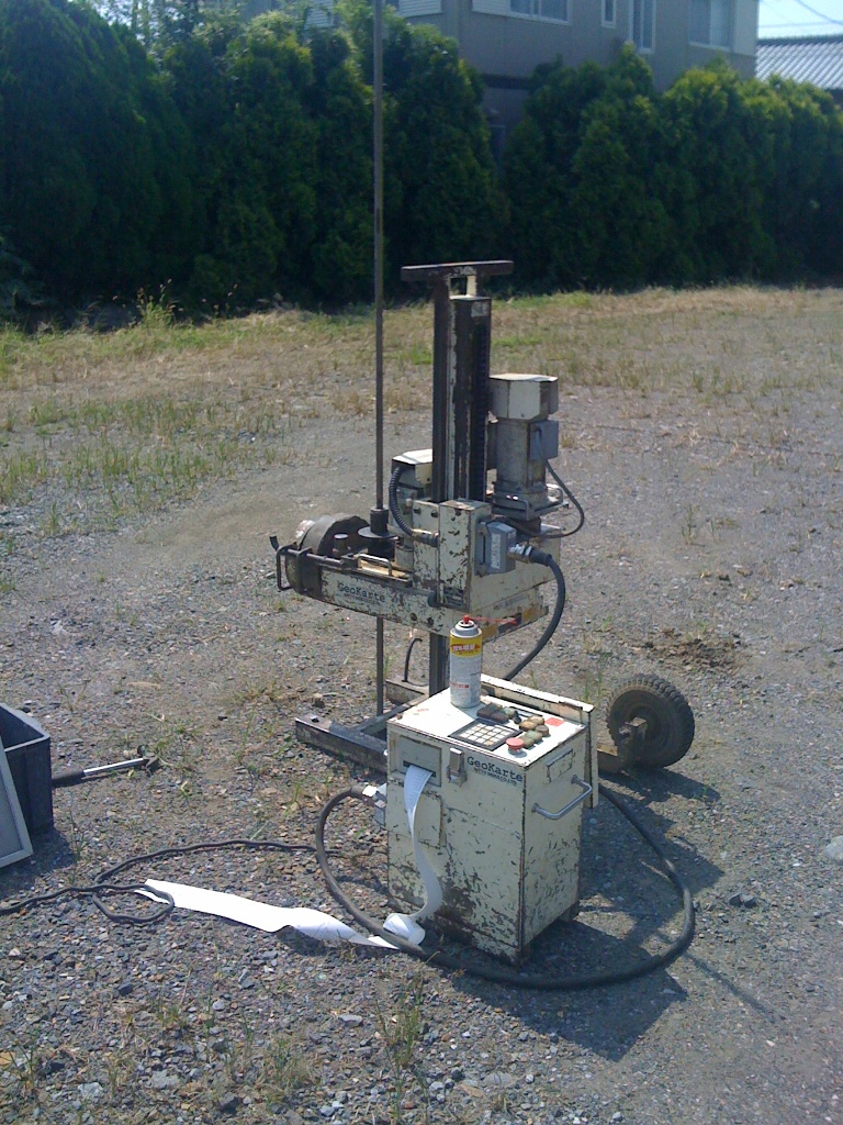 棒の先にドリルがついてて…ガンガン地中に打ち込まれていき…硬い地盤か否かを調査するようです…